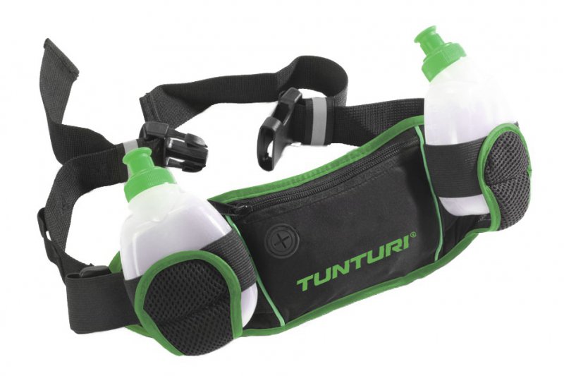 Tunturi Runningbelt. Lehká sportovní ledvinka, elastický pás rychloupínací sponou. Úložný prostor se zipem a otvorem pro sluchátka. Součástí jsou 2 láhve na vodu o objemu 170 ml.