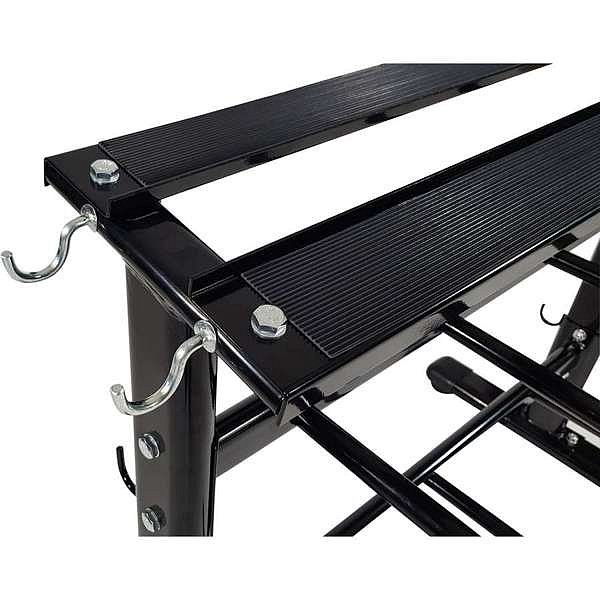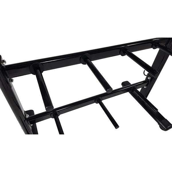 Stojan nabízí celkem 7 nakládacích trnů, horní příčka slouží k uložení činek, po stranách závěsné háčky.