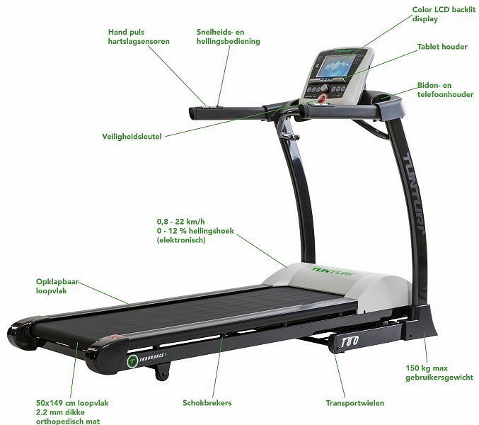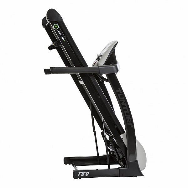 Značka Tunturi poskytuje už mnoho let ověřenou kvalitu zpracování a velký ohled pochopitelně věnuje optimálnímu nastavení, tedy vytvoření správné pohybové ergonomie. Nyní přichází značka Tunturi s novou řadu "TUNTURI Endurance", která přináší nové produkty s aktuálními technickými postupy a moderním desingem. Tato řada je již určena jak do domácího, tak i komerčního prostředí menších klubových posiloven, hotelů, či fyzioterapeutických zařízení. Nový model běžeckého pásu TUNTURI T80 Treadmill Endurance disponuje nízkootočným motorem s trvalým výkonem 5,5 HP (4,04 kW), vysokým záběrovým momentem, rozměrem běžecké plochy 50 x 149, rychlostí od 0,8 až 22 km/h a elektronicky nastavitelným sklonem do 12%. Nosnost trenažéru je 150 kg. Součástí trenažéru jsou transportní kolečka pro lepší manipulaci v prostoru, vyrovnávače nerovnosti a samozřejmě i možnost složení do vertikální pozice pro lepší skladnost stroje. Pro vyšši komfort jsou součástí 2 držáky na vodu a držák na tablet. Trenažér má odpruženou běžeckou plochu (MDF běžecká deska 25 mm) systémem T-Flex. Lze nastavovat rychlost i sklon přes tlačítka na madlech, případně přes "horké klávesy" na konzole trenažéru. Pro okamžité zastavení jsou částí samozřejmě i bezpečnostní klíč.
