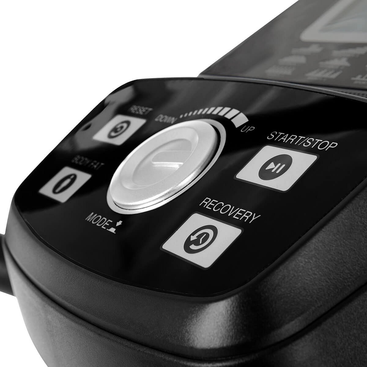 Barevně podsvícený LCD displej PC má držák tabletu a ukazuje všechny důležité hodnoty vašeho tréninku. Kontrolovat tak můžete: rychlost, frekvenci kroků, čas tréninku, vzdálenost, frekvenci tepu, ten je měřen pomocí dlaňových snímačů umístěných na madlech. Přesnějšího měření ale dosáhnete s hrudním pásem o frekvenci 5 kHz, který také zakoupíte u nás. Integrovaný počítač nabízí výběr z 18 programů, z toho 4 HRC programy (stroj nastavuje zátěž dle vaší momentální tepové frekvence), režim recovery, watt, apod.