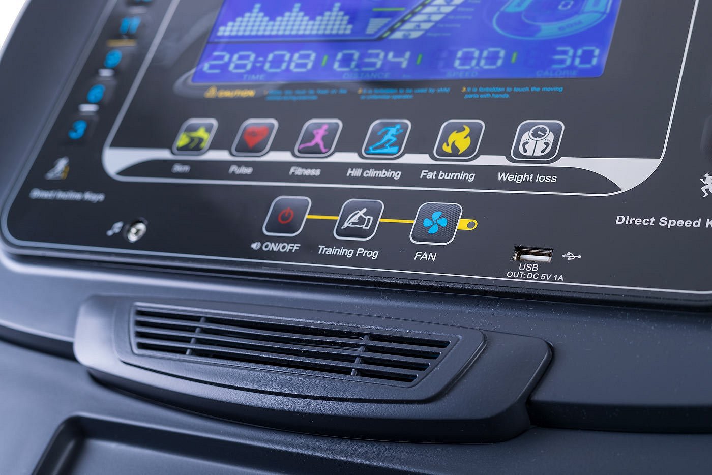 zobrazené základní hodnoty: čas, rychlost, vzdálenost, kalorie, sklon a puls