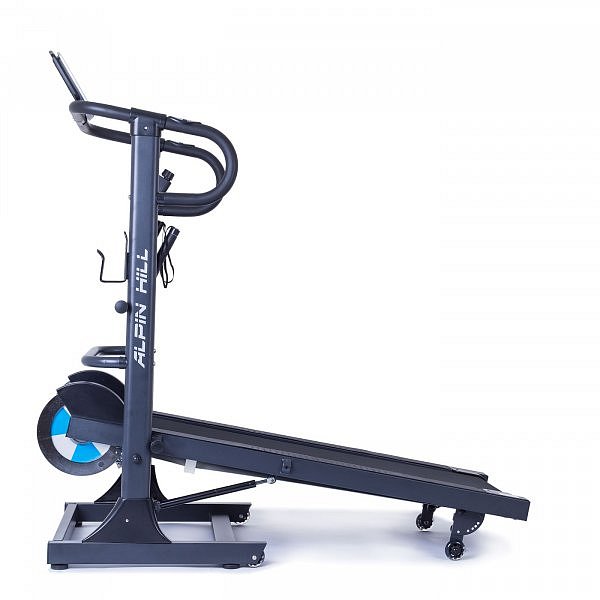 HOUSEFIT ALPIN HILL patří mezi bezmotorové běžecké pásy určené pro domácí, ale i lehce komerční prostředí klubových hotelů, wellness apod.. Díky zdvojenému setrvačníku o hmotnosti 2x9 kg je zaručený plynulý a tichý chod při větším zatížení. Brzda je mechanická třecí, díky níž je vytvářen odpor.