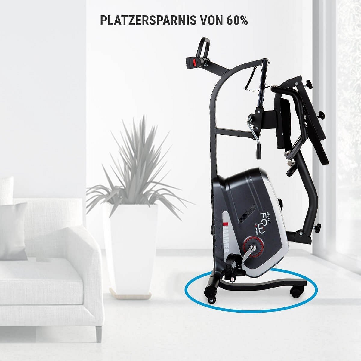 Doma je často málo místa. Horizontální rotoped HAMMER Clever Fold RC5 je dokonalým trenažérem především pro malé prostory. Pomocí tří jednoduchých kroků stroj složíte, zvednete (rozměry po složení: 61 x 62 x 95 cm) a díky transportním kolečkům pohodlně přesunete do rohu místnosti nebo postavíte vedle šatníku. Integrovaný přepravní kolečkový systém zajistí otočení na místě o 360 stupňů, což znamená, že HAMMER RC5 lze snadno přesunout do rohu, za dveře nebo vedle skříně stejně jako kufr, aniž by se zachytil v jakýchkoliv rozích. Maximální stabilitu vám zajistí vyrovnávače nerovnosti podlahy.
