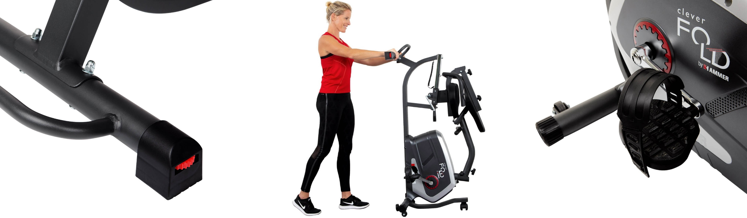 Hammer Clever Fold RC5 je horizontální skládací rotoped neboli recumbent určený především pro rehabilitaci a osoby se sníženou hybností. Díky ergonomicky tvarovanému sedadlu a výškově nastavitelnému opěradlu je trenažér šetrný k vašim zádům. Sedadlo lze pomocí páky snadno a rychle polohovat (vhodné pro menší i větší osoby). Při konstrukci stroje bylo dbáno na kvalitní mechaniku a optimální ergonomii pohybu, a to pro drobnější postavy od 155 cm i vyšší osoby až do 190 cm
