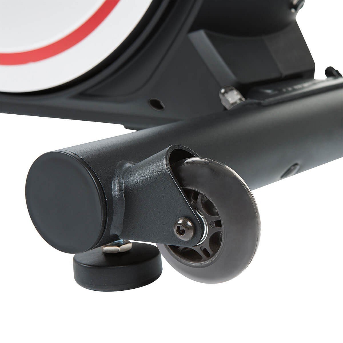 Trenažér FINNLO CleverFold EF90 BT disponuje počítačem s přehledným LCD displejem, držákem na tablet, transportními kolečky a vyrovnávači nerovnosti.