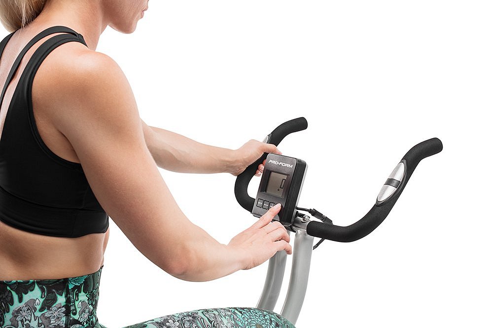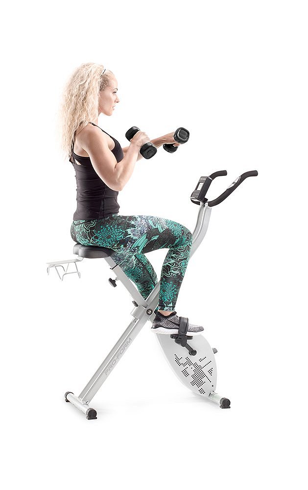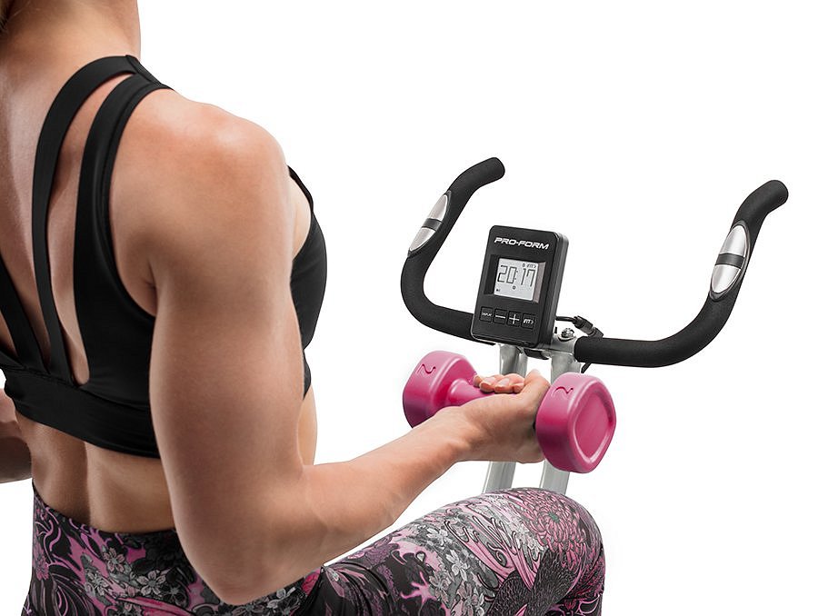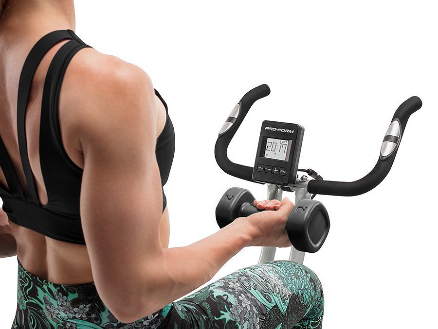 PRO-FORM PF X-Bike je vybaven podsvíceným 3“ LCD displejem, který prezentuje všechny důležité tréninkové informace jako je délka cvičení, rychlost, spálené kalorie, ujetá vzdálenost, frekvence otáček a tepová frekvenci, která je snímána přes tzv. „hand pulsy“, neboli dlaňové senzory umístěné na madlech. Pro oživení monotónní jízdy je stroj vybaven i párem kilogramových činek, díky nimž posílíte, protáhnete nebo případně jen podpoříte správnou funkci paží.