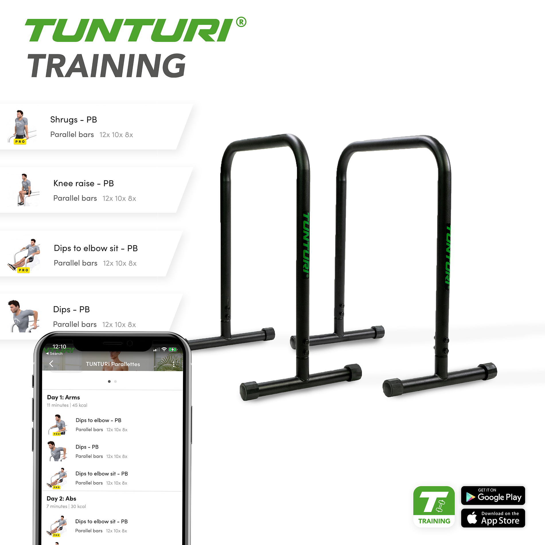Tunturi Parallettes jsou zmenšenou verzí opěrek na kliky gymnastického nářadí se dvěma rovnoběžnými nosníky. Jsou vynikající pro hluboké kliky na rukou, tricepsové dipy, L-sedy nebo cviky planche, a to vše bez přetěžování zápěstí. Cvičením s paralelkami pracujete na své síle, rovnováze a kontrole. Dobře se hodí ke kalanetice a street fitness tréninkům.