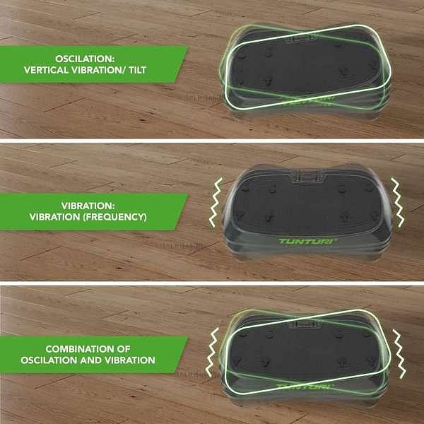 Vibrační deska má tři polohy: oscilace, vibrace a kombinace obou. Vibrace znamená, že deska jde nahoru a dolů rychlým tempem. Oscilace je švihový pohyb. Obojí zajišťuje vyvedení těla z rovnováhy a nutí svaly se napínat, aby udržely rovnováhu. To vám umožní procvičit mnoho svalových skupin bez složitých cviků. Tato kombinace vytváří trojrozměrný cvičební efekt pro maximální výzvu. Vibrační deska je také vynikající pro méně intenzivní program, jako je relaxace po cvičení.