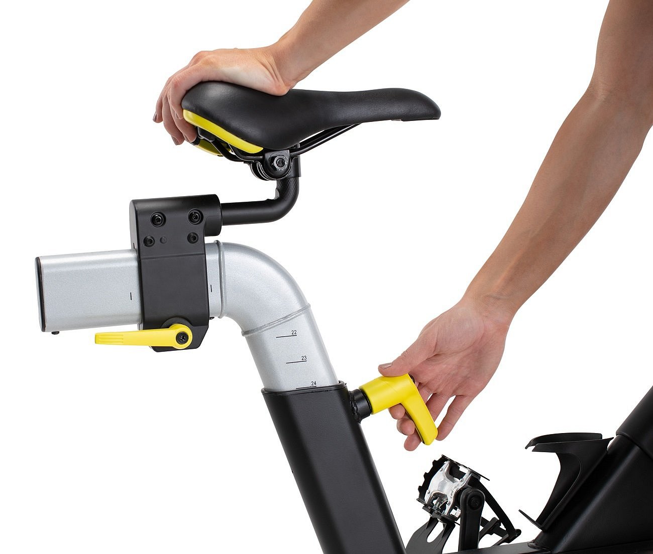 Ergonomicky tvarované sedlo je polohovatelné nejen výškově, ale i v horizontálním směru, Navíc můžete upravit i jeho sklon. Výškově nastavitelné jsou i víceúchopová řidítka z protiskluzového materiálu. Držák na lahev s vodou je umístěn stejně jako u klasického kola na jeho rámu. Cyklotrenažér tak poskytne dokonalý zážitek z jízdy s maximálním komfortem pro každou postavu.