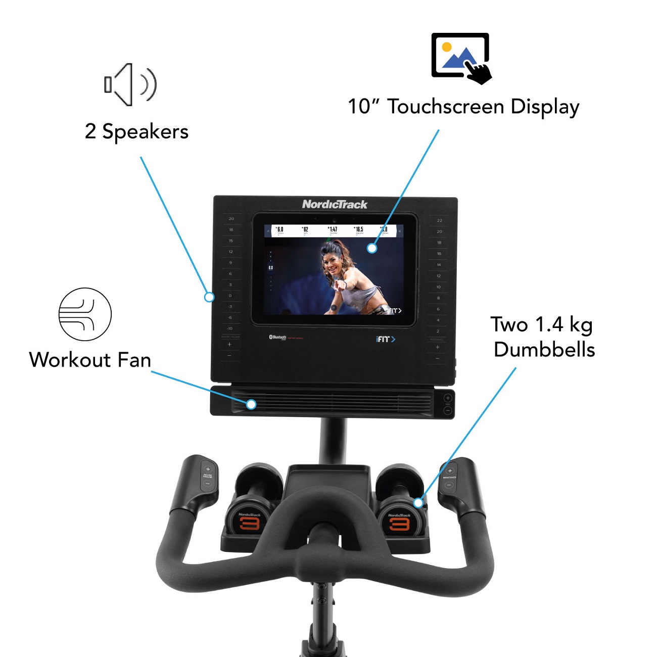 Gelové sedlo je ergonomicky tvarované a je jednoduše nastavitelné jak ve vertikální, tak i v horizontální poloze, včetně jeho sklonu. Protiskluzová řidítka jsou výškově i horizontálně nastavitelná a umožňují vícepolohový úchop. Pitný režim dodržíte i během jízdy, držáky na lahev jsou umístěné pod řidítky. Dalším bonusem trenažeru NordicTrack Studio 10i jsou činky jednoručky, každá o hmotnosti 1,4 kg. Ani horní polovina těla tak nezůstane bez tréninku.