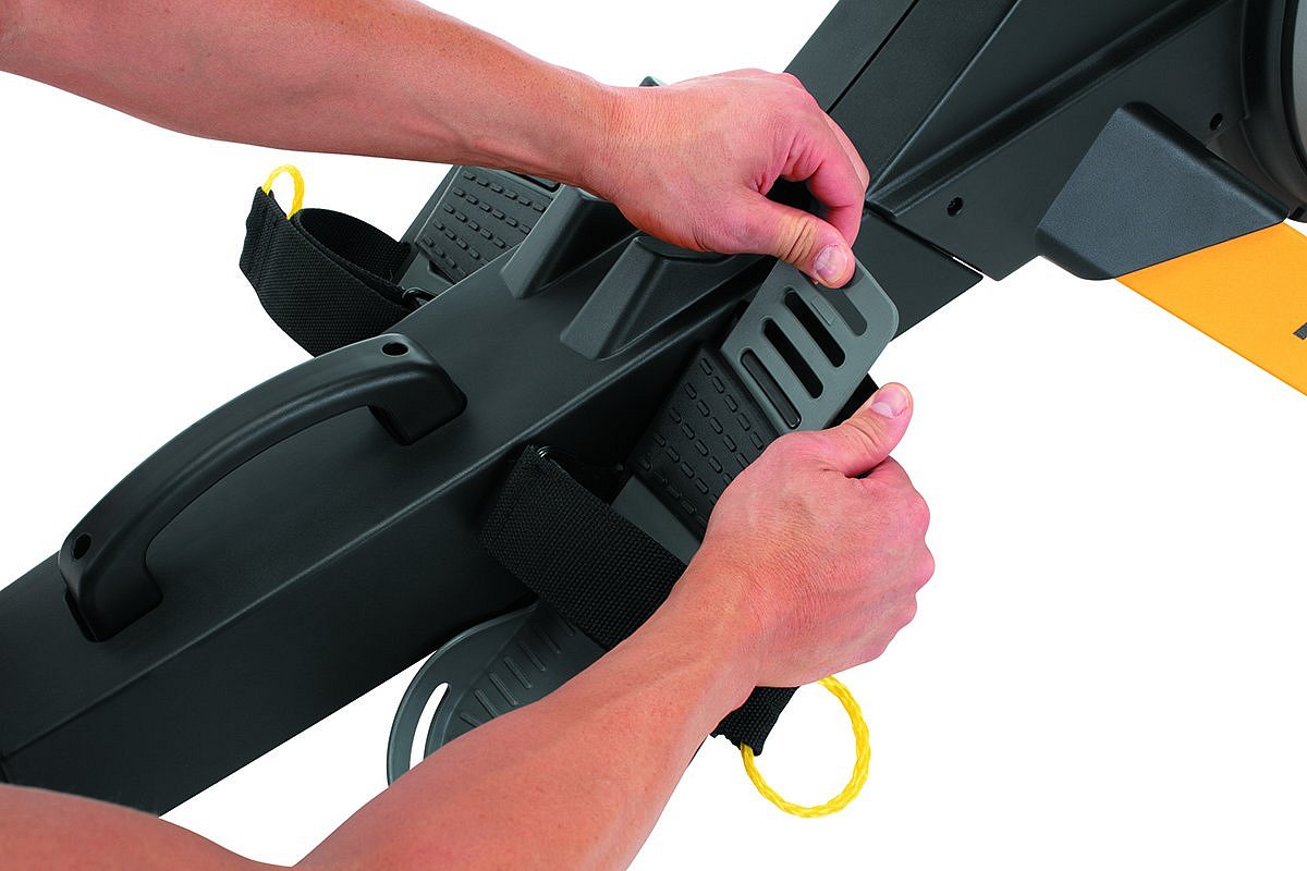 Veslo disponuje profesionálními protiskluzovými nastavitelnými nášlapnými pedály pro vaši bezpečnost s fixovacím řemínkem.