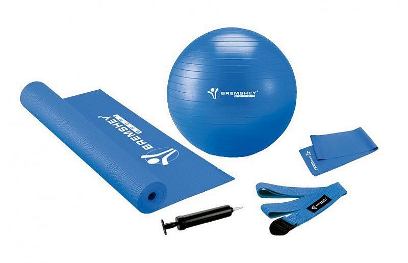 Bremshey Pilates&Fitness Set obsahuje gymnastický míč o průměru 55 cm z materiálu odolného proti prasknutí, podložku na cvičení, latexovou pásku na cvičení, joga-pásku a pumpičku. Barva modrá.