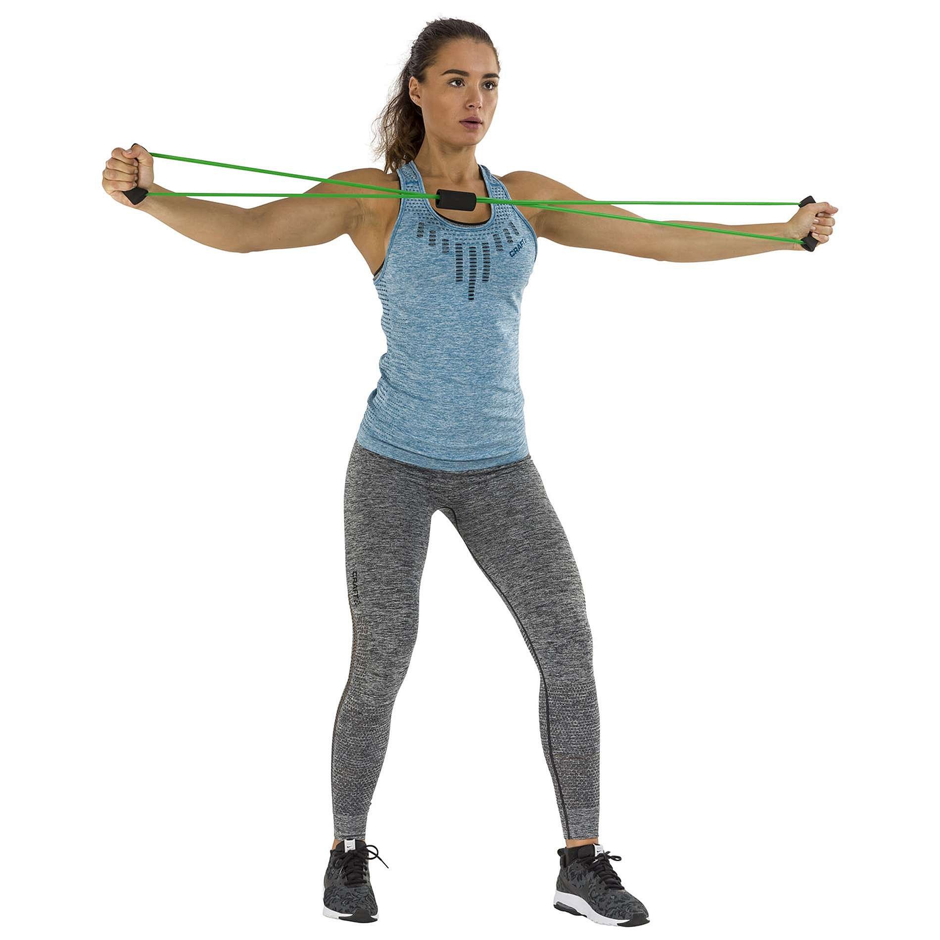 Představujeme vám tento všestranný fitness doplněk Tunturi: Tubing s držadly! Sada obsahující 3 různé modely tubingů s mírným odporem. Sadu lze použít pro trénink svalů paží, hrudníku a ramen. Cviky, jako je bicepsové zkracování, zvedání ramen a tricepsové extenze, abychom jmenovali alespoň několik příkladů. Svaly nohou můžete posílit prováděním výpadů nad hlavu nebo dřepů nad hlavou. Sada trubek se snadno přenáší. Trénujte doma, v parku, v posilovně nebo na pláži. K dispozici také se středním a těžkým odporem.